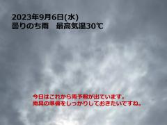 鍼灸予約 9月6日(水) 曇り時々雨 最高気温30℃(京都の鍼灸院 泰楽)