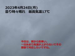 鍼灸予約 4月24日(月) 曇り時々晴れ 最高気温17℃(京都の鍼灸院 泰楽)